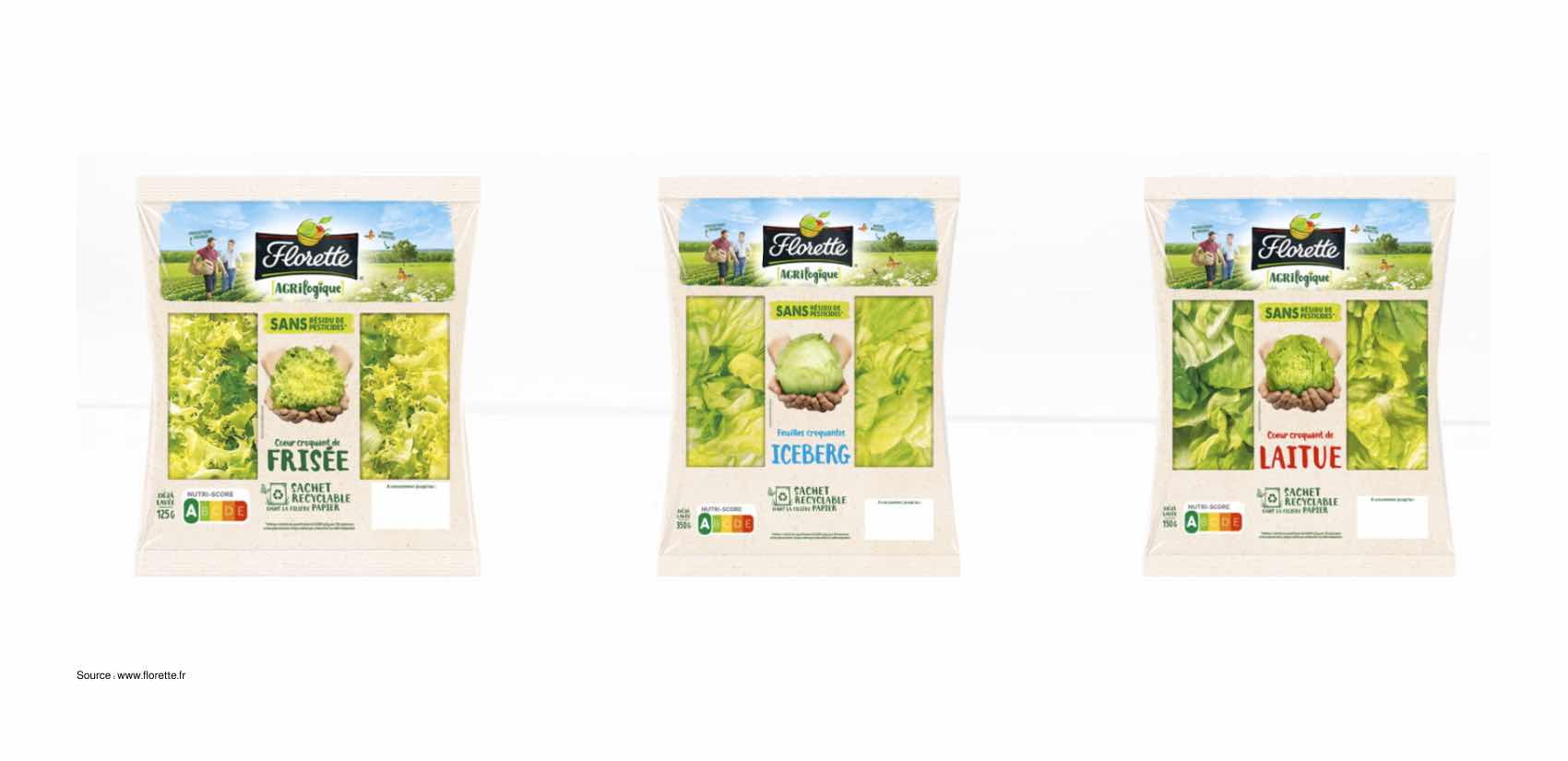 En termes de tendances, on peut noter évidemment le souci croissant des industriels de fabriquer des emballages durables, réutilisables, en optant pour des matériaux éco-responsables ou biodégradables (cf. sachet en papier de la marque Florette pour sa gamme Agrilogique, qui a été validé par les organismes en charge des filières de recyclage en France).
