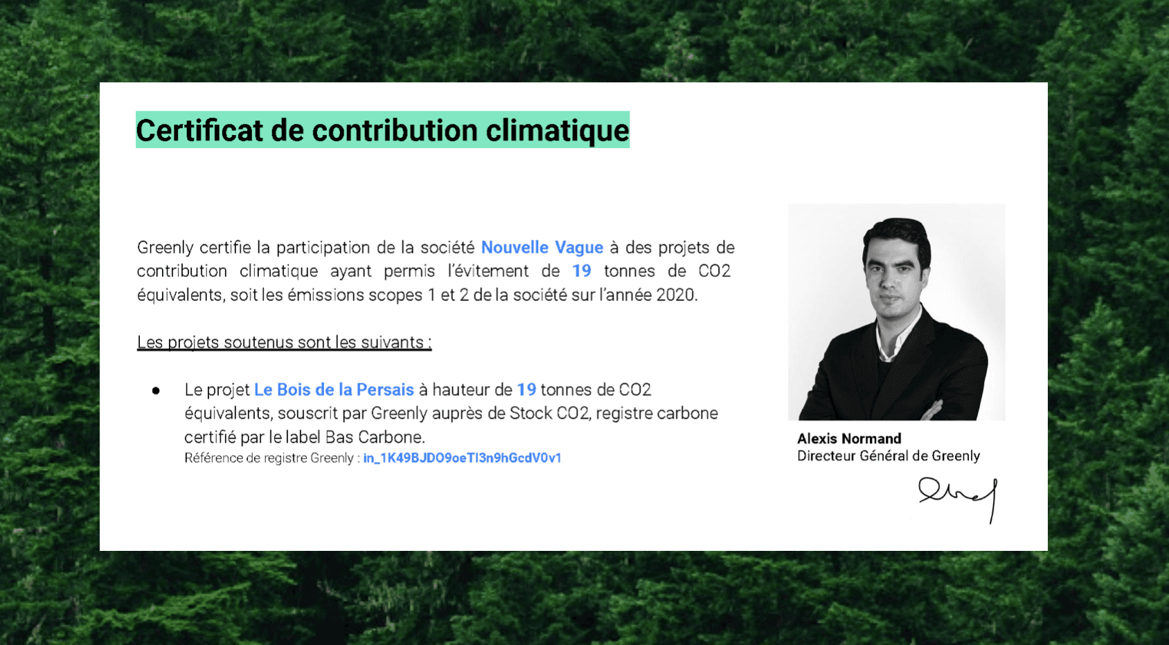 Nous avons fait notre bilan carbone avec Greenly et avons décidé de compenser nos scopes 1 et 2 (2020). Nous versons une contribution carbone à Greenly pour boiser des parcelles agricoles “Le Bois de Persais” situé à Maumuson (44540 Vallons de l’Erdre).