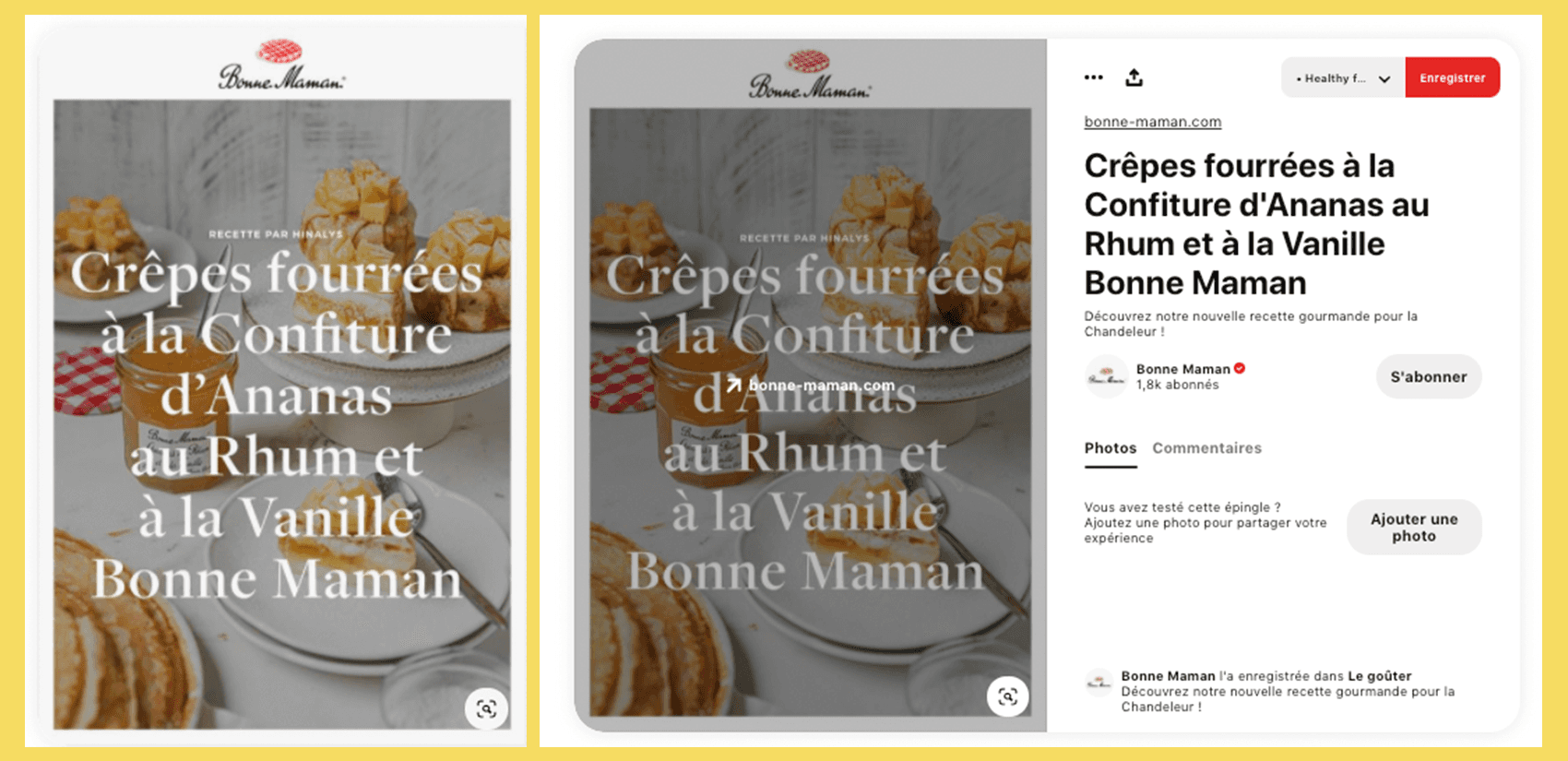 Sur une épingle Pinterest, il est possible d’ajouter un lien qui redirige directement vers une page du site, créant ainsi du trafic facilement à partir du moment où l’intérêt est présent. Par exemple, une marque food qui partage un visuel de recette peut rediriger les internautes vers la page du site contenant la recette. Exemple Bonne Maman