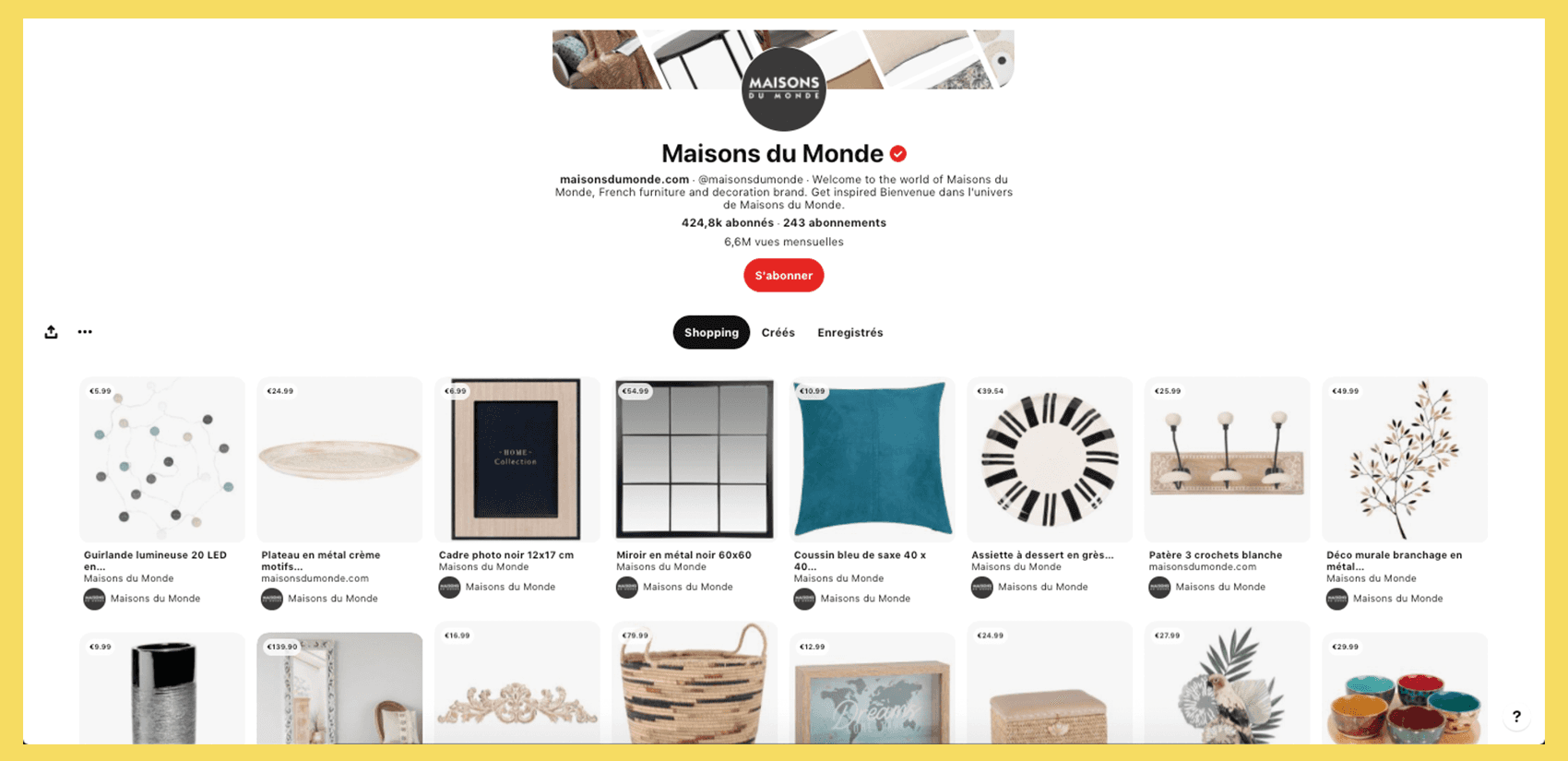 Grâce à la fonctionnalité Shopping sur Pinterest, les utilisateurs peuvent connaître les informations sur le coût des produits ainsi que la disponibilité de l’article qu’ils désirent, tout en finalisant leur achat directement sur le site e-commerce de la marque. Exemple : Maison du Monde