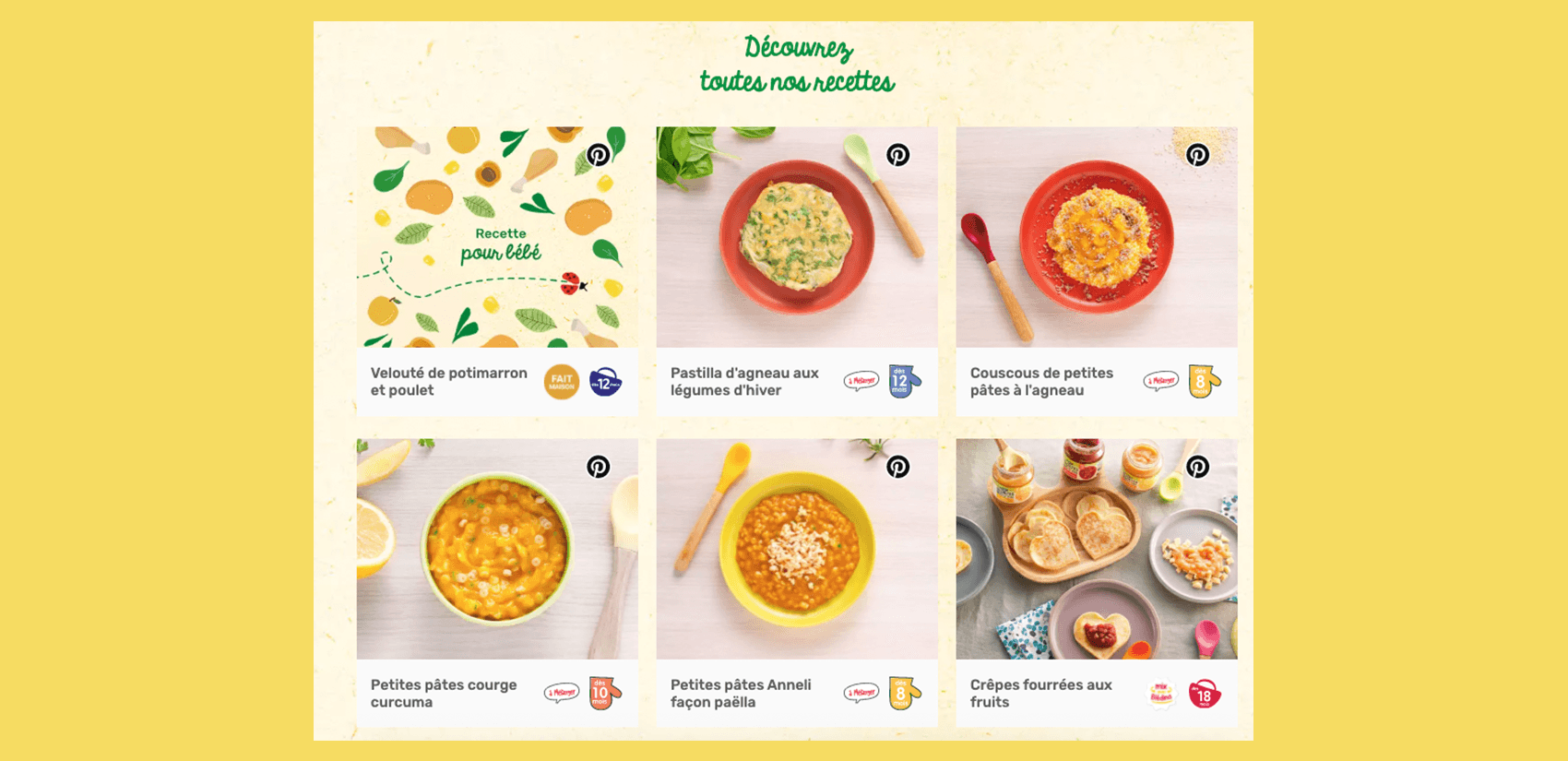 Côté site, lorsque le plugin “Pin IT” est installé, les membres de Pinterest peuvent enregistrer directement les contenus des marques sur leurs propres tableaux et ainsi leur faire gagner en visibilité sans avoir à créer l’épingle. C’est une démultiplication de contenu qui agit positivement sur le référencement des sites et donc sur leur trafic. Exemple du site Blédina.