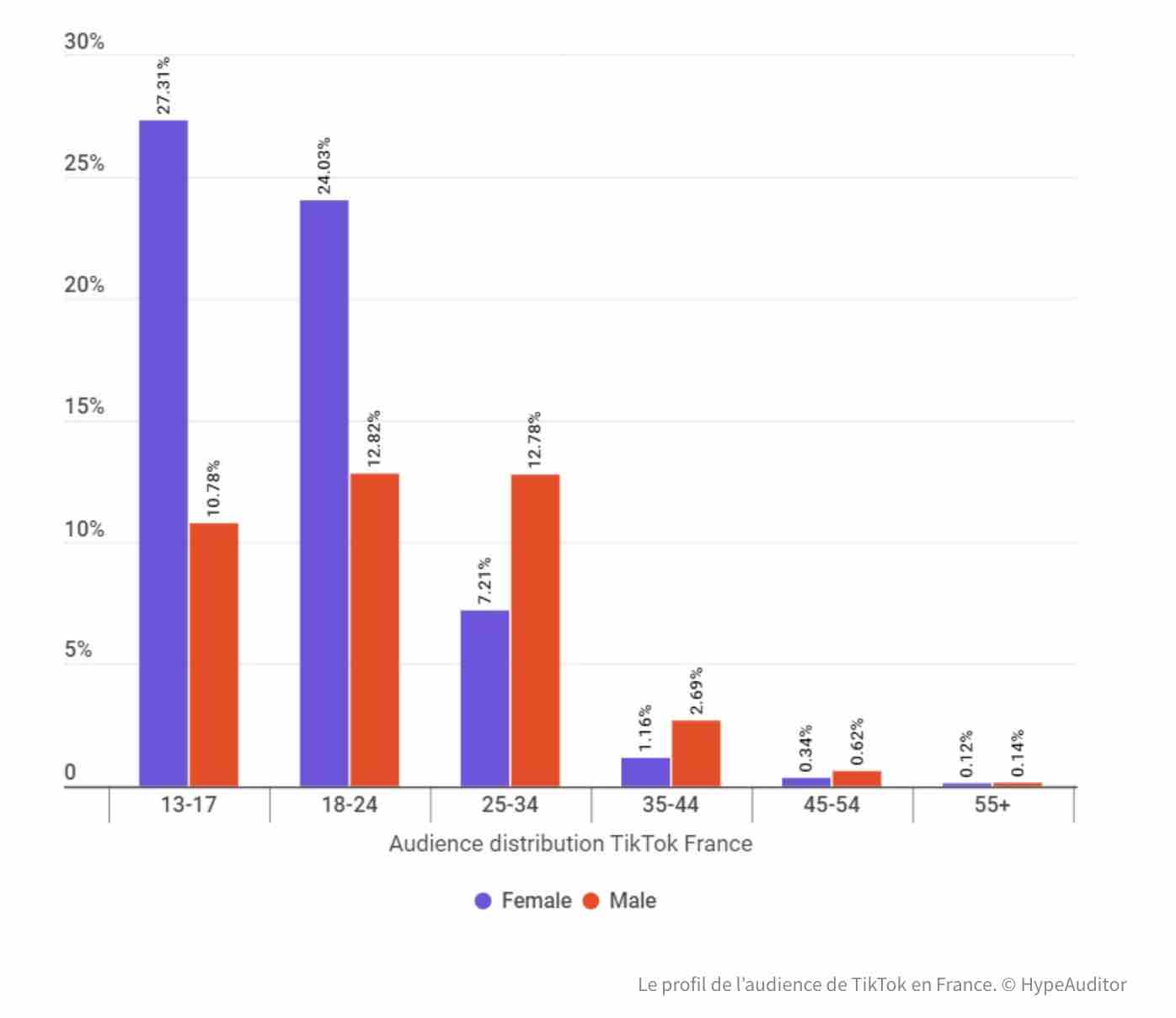 57 % des utilisateurs ont entre 13 et 24 ans (source : juin 2020 – Les Echos). Un pourcentage que l’on retrouve quasiment sur le marché français.