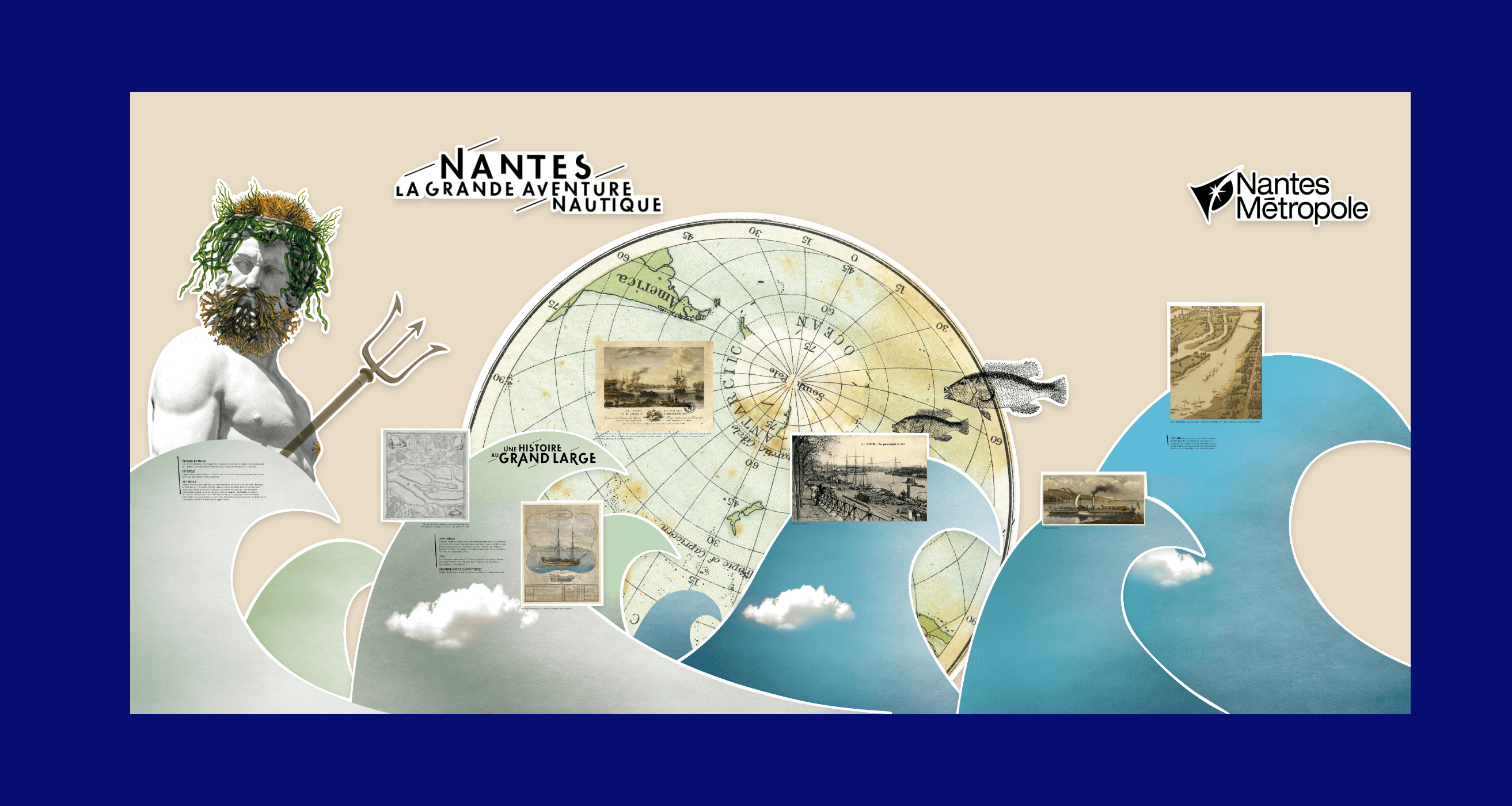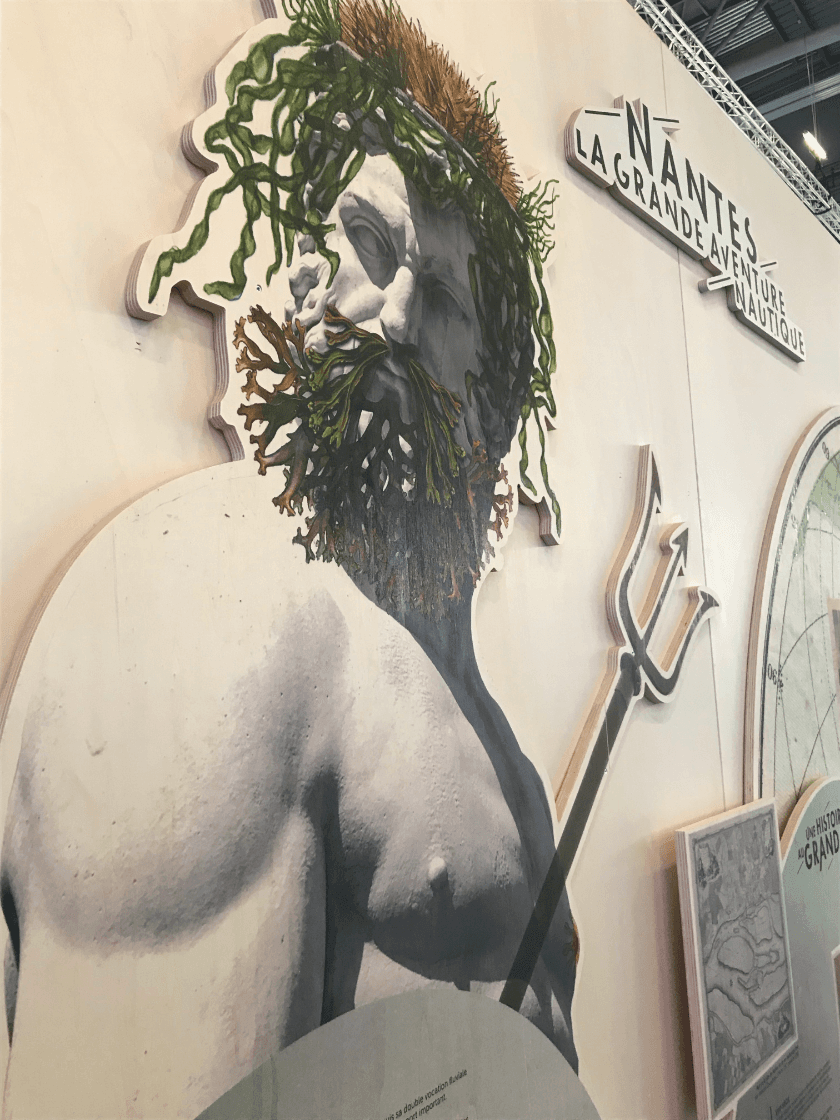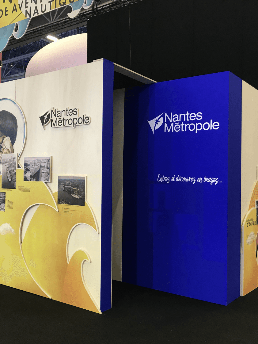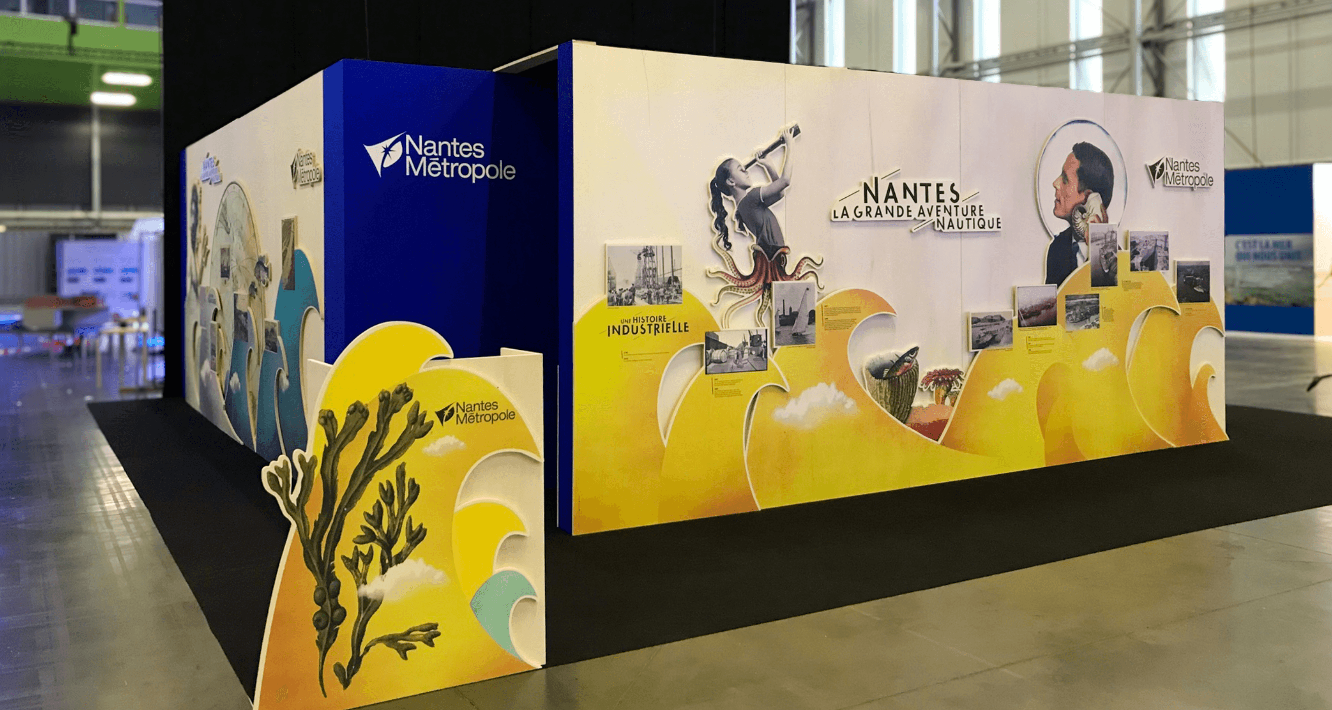 A 100 m2 booth at the Parc des Expositions during the LA MER XXL event. With a strong message to convey: Nantes, a great maritime and river city, which throughout its history has always looked towards its river and been inspired by it. But how to manage to stand out at this leading nautical meeting, despite a limited area of expression?